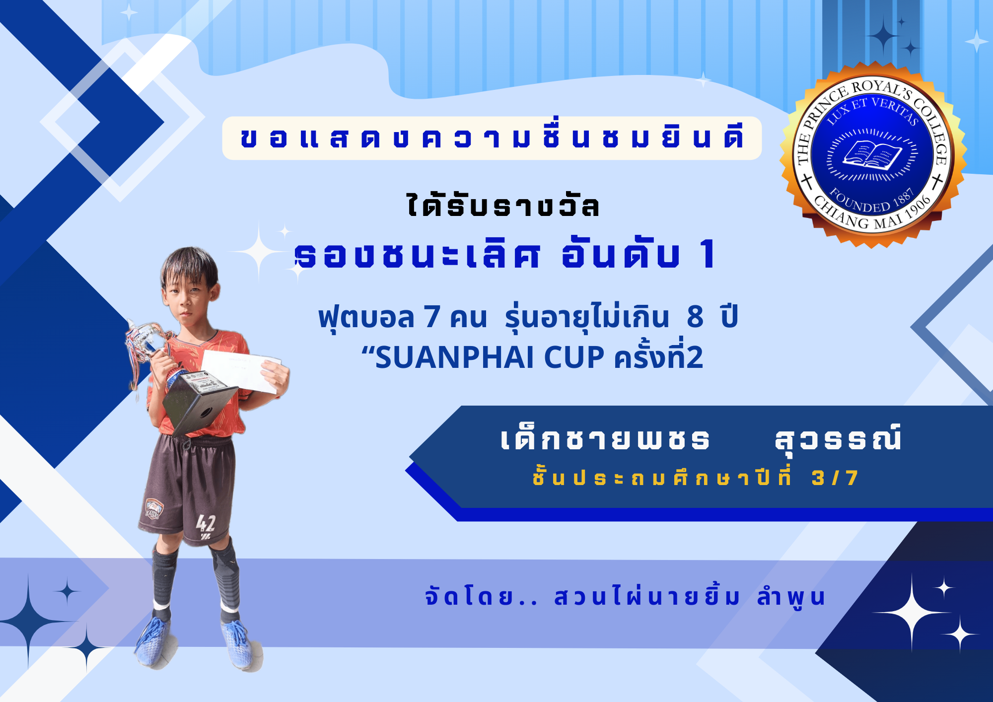 ขอชื่นชมและร่วมแสดงความยินดีกับ เด็กชายพชร สุวรรณ์ ชั้นประถมศึกษาปีที่ 3/7 ที่ได้รับรางวัลรองชนะเลิศอันดับ 1 ฟุตบอล7คน รุ่นอายุไม่เกิน 8 ปี “SUANPHAI CUP ครั้งที่2”
