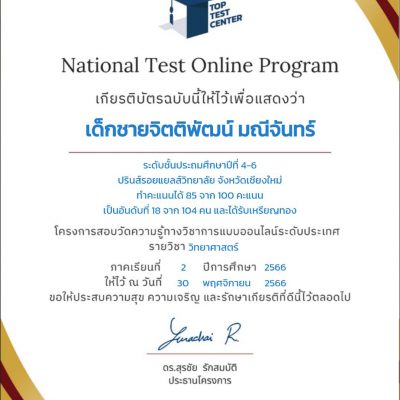 จากโครงการสอบวัดความรู้ทางวิชาการแบบออนไลน์ระดับประเทศ National Test Online Program จัดโดย Toptest Center