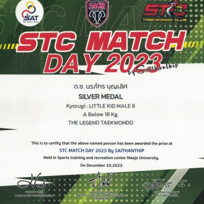รางวัลรองชนะเลิศ เหรียญเงิน Kyorugi : Little Kid Male 6 A Below 18 Kg.