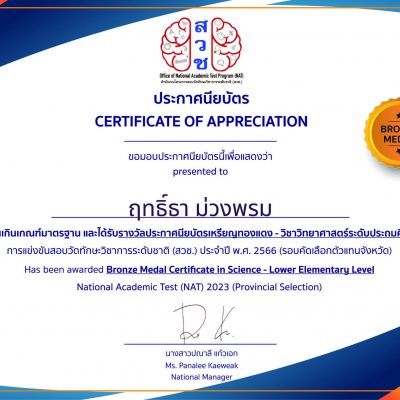ขอชื่นชมและร่วมแสดงความยินดีกับเด็กชายฤทธิ์ธา ม่วงพรม ชั้นประถมศึกษาปีที่ 3 ที่ได้รับรางวัลประกาศนียบัตรเหรียญทองแดง วิชาวิทยาศาสตร์ระดับประถมศึกษาตอนต้น ประกาศนียบัตรชมเชย วิชาภาษาอังกฤษระดับประถมศึกษาตอนต้น และประกาศนียบัตรชมเชย วิชาคณิตศาสตร์ระดับประถมศึกษาตอนต้น ในการแข่งขันสอบวัดทักษะวิชาการระดับชาติ (สวช.) ประจำปี 2566 (รอบคัดเลือกตัวเเทนจังหวัด) เมื่อวันที่ 11 พฤศจิกายน 2566
