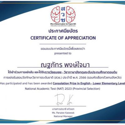 เด็กชายณฐภัทร พงษ์ใจมา ชั้นประถมศึกษาปีที่ 3/13 ได้รับประกาศนียบัตรรางวัลชมเชย วิชาภาษาอังกฤษระดับประถมศึกษาตอนต้น