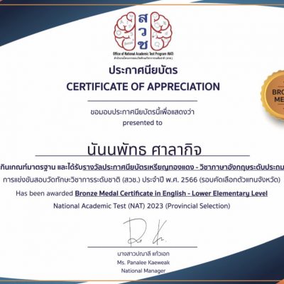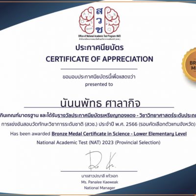ขอชื่นชมและร่วมแสดงความยินดีกับเด็กหญิงนันนพัทธ ศาลากิจ ชั้นประถมศึกษาปีที่ 3 ที่ได้รับรางวัลประกาศนียบัตรเหรียญทองแดง วิชาวิทยาศาสตร์ระดับประถมศึกษาตอนต้น และประกาศนียบัตรเหรียญทองแดง วิชาภาษาอังกฤษระดับประถมศึกษาตอนต้น ในการแข่งขันสอบวัดทักษะวิชาการระดับชาติ (สวช.) ประจำปี พ.ศ.2566 (รอบคัดเลือกตัวแทนจังหวัด) จัดโดย สำนักงานโครงการสอบวัดทักษะวิชาการระดับชาติ (สวช.) ณ โรงเรียนปรินส์รอยแยลส์วิทยาลัยเชียงใหม่ เมื่อวันที่ 11 พฤศจิกายน 2566