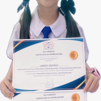ขอชื่นชมและร่วมแสดงความยินดีกับเด็กหญิงนพนิตา จันทร์มา ชั้นประถมศึกษาปีที่ 3 ที่ได้รับรางวัลประกาศนียบัตรเหรียญทองแดง วิชาวิทยาศาสตร์ ระดับประถมศึกษาตอนต้น และประกาศนียบัตรเหรียญทองแดง วิชาภาษาอังกฤษ ระดับประถมศึกษาตอนต้น ในการแข่งขันสอบวัดทักษะวิชาการระดับชาติ (สวช.) (National Academic Test Program) ประจำปี พ.ศ. 2566 (รอบคัดเลือกตัวแทนจังหวัด) เมื่อวันที่ 11 พฤศจิกายน 2566