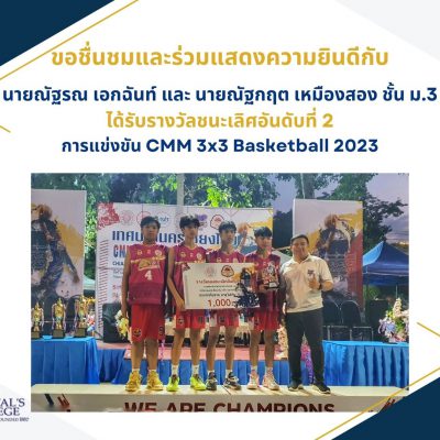 ขอชื่นชมและแสดงความยินดีกับนายณัฐรณ เอกฉันท์ และ นายณัฐกฤต เหมืองสอง นักเรียนมัธยมศึกษาปีที่ 3 ได้รับรางวัลชนะเลิศอันดับ 2 ในการแข่งขันกีฬาบาสเก็ตบอล CMM 3×3 Basketball 2023 เทศบาลนครเชียงใหม่ คัพ 2023 รุ่นอายุไม่เกิน 15 ปี (U15) ชาย จัดโดย สมาคมชาวเชียงใหม่เชื้อสายยูนนาน ร่วมกับ กองทุนหลักประกันสุขภาพท้องถิ่น เทศบาลนครเชียงใหม่, โรงแรมสมายล์ ล้านนา, ฝ่ายกีฬาบาสเกตบอล สมาคมกีฬาแห่งจังหวัดเชียงใหม่, ฝ่ายกิจกรรมเด็กและเยาวชน ส่วนส่งเสริมการศึกษา ศาสนาและวัฒนธรรม สำนักการศึกษา เทศบาลนครเชียงใหม่ ระหว่าง วันที่ 1 – 3 ธันวาคม 2566 ณ สวนสาธารณะหนองบวกหาด อำเภอเมือง จังหวัดเชียงใหม่