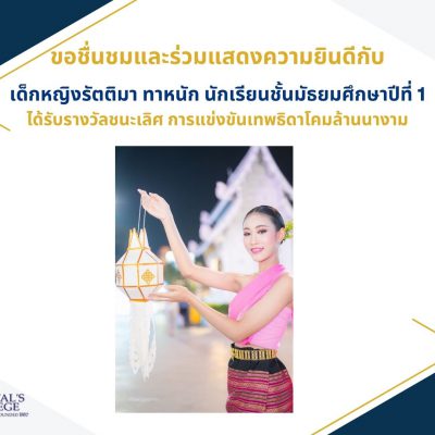 ขอชื่นชมและแสดงความยินดีกับ ด.ญ รัตติมา ทาหนัก นักเรียนชั้นมัธยมศึกษาปีที่ 1 ได้รับรางวัลชนะเลิศอันดับ 1 การประกวดเทพธิดาโคมล้านนางาม ณ ห้าง เมญ่า เมื่อวันที่ 30 พฤศจิกายน 2566