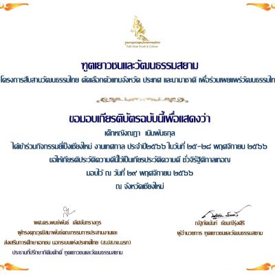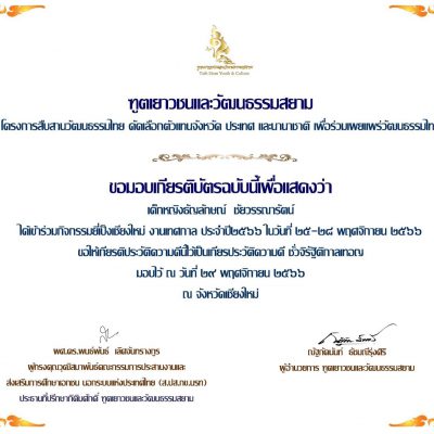 จัดโดย สนับสนุนโครงการโดย อาจารย์วรรณ ศุภพัชญ์ สวนแก้ว ผู้บริหาร Training Room Chiangmai CHALLENGER KIDS ฑูตเยาวชนและวัฒนธรรมสยาม เมื่อวันที่ ๒๕-๒๘ พฤศจิกายน ๒๕๖๖