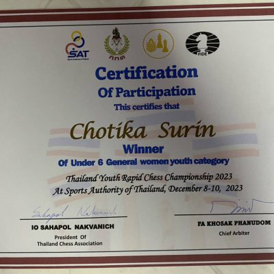 เด็กหญิงโชติกา สุรินทร์ ป.1/3 ชนะเลิศ การแข่งขันกีฬาหมากรุกสากลเยาวชน ประเภทราปิด(Rapid)ชิงแชมป์ประเทศไทย สมาคมกีฬาหมากรุกสากลแห่งประเทศไทย