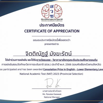 เด็กหญิงจิตติณัฏฐ์ มังฆะรัตน์ ระดับชั้นประถมศึกาาปีที่ 2/1 ได้เข้าร่วมการแข่งขันและได้รางวัลชมเชย วิชาภาษาอังกฤษระดับประถมศึกษาตอนต้น การแข่งขันสอบวัดทักษะวิชาการระดับชาติ (สวช) ประจำปี พ.ศ. 2566