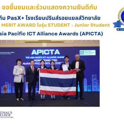 ขอชื่นชมและแสดงความยินดี กับ ทีม PasX+ โรงเรียนปรินส์รอยแยลส์วิทยาลัย ได้รับรางวัล MERIT AWARD ในรุ่น STUDENT – Junior Student การแข่งขันงาน Asia Pacific ICT Alliance Awards (APICTA) ที่ประเทศ ฮ่องกง วันที่ 5-9 ธันวาคม 2563