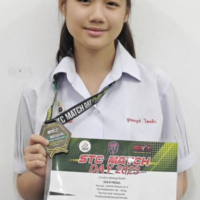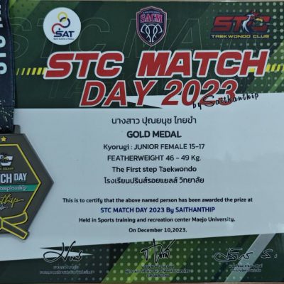 ขอชื่นชมและแสดงความยินดีกับ นางสาวปุณยนุช ไทยขำ ม.4/4 ที่ได้รับรางวัลชนะเลิศอันดับ 1 (เหรียญทอง) Kyorugi : JUNIOR FEMALE 15-17 FEATHERWEIGHT 46 – 49 Kg. จากการแข่งขัน STC MATCH DAY 2023 TAEKWONDO CHAMPIONSHIP เมื่อวันที่ 10 ธันวาคม 2566 ณ ศูนย์กีฬาและนันทนาการ มหาวิทยาลัยแม่โจ้ จังหวัดเชียงใหม่