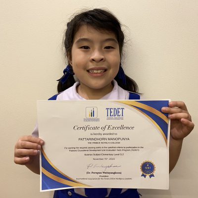 ขอชื่นชมและร่วมแสดงความยินดันกับ เด็กหญิงภัทรินธรณ์ มะโนปัญญา ชั้นประถมศึกษาปีที่ 2/5 ที่ได้รับรางวัล ชมเชยวิชาคณิตศาสตร์ โครงการประเมินและพัฒนาสู่ความเป็นเลิศทางคณิตศาสตร์และวิทยาศาสตร์ (TEDET) ประจำปี 2566 จัดโดย Thailand Education Development and Evaluation Tests (TEDET) ณ โรงเรียนปรินส์รอยแยลส์วิทยาลัย เมื่อวันที่ 3 กันยายน พ.ศ. 2566