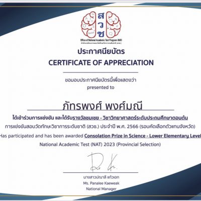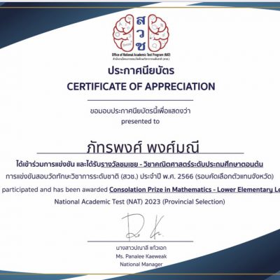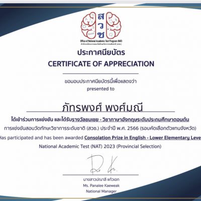 ขอชื่นชมและร่วมแสดงความยินดักับ เด็กชายภัทรพงศ์ พงศ์มณี ชั้นประถมศึกษาปีที่ 2/3 ได้รับรางวัลชมเชย วิชาภาษาอังกฤษ วิชาคณิตศาสตร์และวิชาวิทยาศาสตร์ระดับประถมศึกษาตอนต้น การแข่งขันสอบวัดทักษะวิชาการระดับชาติ(สวช.) ประจำปี พ.ศ. 2566 จัดโดย สำนักงานโครงการสอบวัดทักษะวิชาการระดับชาติ(สวช.) ณ โรงเรียนปรินส์รอยแยลวิทยาลัย เมื่อวันที่ 11 พฤศจิกายน 2566