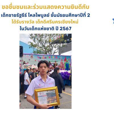 ขอแสดงความยินดีกับ เด็กชายรัฐธีร์ ไหลไพบูลย์ นักเรียนชั้นมัธยมศึกษาปีที่ 2 ที่ได้รับคัดเลือกให้ได้รับรางวัล “เด็กดีศรีนครเชียงใหม่”เนื่องในวันเด็กแห่งชาติ วันที่ 13 มกราคม 2564 จัดโดยเทศบาลนครเชียงใหม่