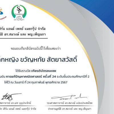 ขอชื่นชมและร่วมแสดงความยินดีกับ เด็กหญิงขวัญหทัย สัตยาสวัสดิ์ ชั้นประถมศึกษาปีที่ 2/1 ได้รับรางวัลชมเชยในการสอบแข่งขันการแก้ปัญหาคณิตศาสตร์ระดับชั้นประถมศึกษาปีที่ 2 จากการแข่งขันการแก้ปัญหาคณิตศาสตร์ ปี พ.ศ.2566 จัดโดยบริษัท เลิร์นแอนด์เพลย์ แมธกรุ๊ป จำกัดและมูลนิธิ ดร.สมวงษ์ และ พญ.เพ็ญนภา ณ โรงเรียนสารสาสน์วิเทศ จังหวัดเชียงใหม่ เมื่อวันที่ 25 พฤศจิกายน 2566