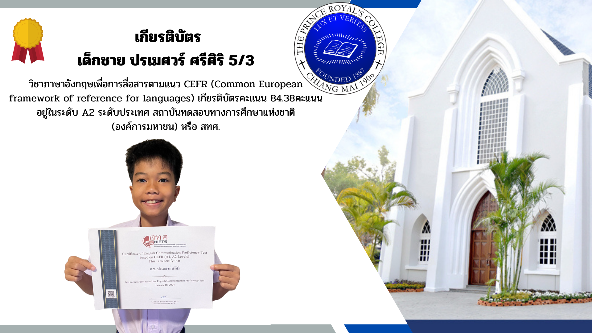 ที่ได้รับเกียรติบัตรคะแนน 84.38คะแนน อยู่ในระดับ A2 ระดับประเทศ สถาบันทดสอบทางการศึกษาแห่งชาติ (องค์การมหาชน) หรือ สทศ วิชาภาษาอังกฤษเพื่อการสื่อสารตามแนว CEFR (Common European framework of reference for languages)