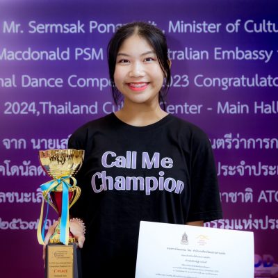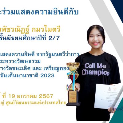 ขอชื่นชมและแสดงความยินดีกับ เด็กหญิงพัชรณัฏฐ์ ภมรไมตรี นักเรียนชั้นมัธยมศึกษาปีที่ 2 ในพิธีเข้ารับโอวาท และ แสดงความยินดี จากรัฐมนตรีว่าการกระทรวงวัฒนธรรม นายเสริมศักดิ์ พงษ์พานิช และเอกอัครราชฑูตออสเตรเลียแห่งประเทศไทย ให้กับ เยาวชน และผู้ควบคุมทีม ที่ได้รับรางวัลชนะเลิศ และ เหรียญทอง จาก การแข่งขันเต้นนานาชาติ 2023 ชิงถ้วยพระราชทาน สมเด็จพระกนิษฐาธิราชเจ้า กรมสมเด็จพระเทพรัตนราชสุดาฯ สยามบรมราชกุมารี ของสมาคมเอทีโอดีเพื่อพัฒนาเด็กและเยาวชน วันศุกร์ ที่ 19 มกราคม 2567 ณ หอประชุมใหญ่ ศูนย์วัฒนธรรมแห่งประเทศไทย