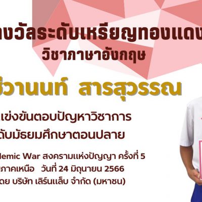 ขอชื่นชมและแสดงความยินดีกับ นายชีวานนท์ สารสุวรรณ ม.5/11 ที่ได้รับรางวัลระดับเหรียญทองแดง จากการแข่งขันตอบปัญหาวิชาการ ระดับมัธยมศึกษาตอนปลาย วิชาภาษาอังกฤษ ในงาน Academic War สงครามแห่งปัญญา ครั้งที่ 5 ระดับภาคเหนือ วันที่ 24 มิถุนายน 2566 จัดโดย บริษัท เลิร์นแล็บ จำกัด (มหาชน)