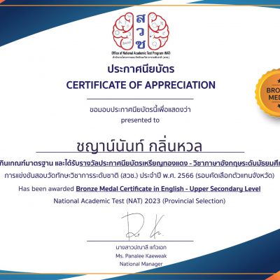 ขอชื่นชมและแสดงความยินดีกับ นางสาวชญาน์นันท์ กลิ่นหวล ม.5/7 รับรางวัลประกาศนียบัตรเหรียญทองแดง วิชาภาษาอังกฤษระดับมัธยมศึกษาตอนปลาย จากการแข่งขันสอบวัดทักษะวิชาการ ระดับชาติ (สวช.) ประจำปี พ.ศ.2566 (รอบคัดเลือกตัวแทนจังหวัด) จัดโดย สำนักงานโครงการสอบวัดทักษะวิชาการระดับชาติ (สวช.) เมื่อวันที่ 11 พฤศจิกายน 2566 ณ โรงเรียนปรินส์รอยแยลส์วิทยาลัย