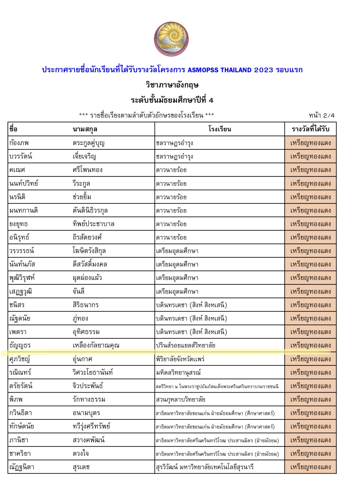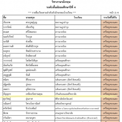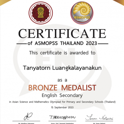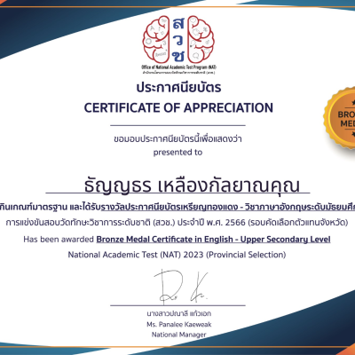 - รางวัลประกาศนียบัตรเหรียญทองแดง วิชาภาษาอังกฤษระดับมัธยมศึกษาตอนปลาย การแข่งขันสอบวัดทักษะวิชาการระดับชาติ (สวช.) ประจำปี พ.ศ. 2566 (รอบคัดเลือกตัวแทนจังหวัด)(ระดับจังหวัด) วันที่ 11 พฤศจิกายน 2023 ณ โรงเรียนปรินส์รอยแยลส์วิทยาลัย จัดโดย สำนักงานโครงการ สอบวัดทักษะวิชาการระดับชาติ (สวช.)