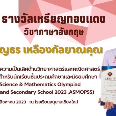 - รางวัลเหรียญทองแดง วิชาภาษาอังกฤษโครงการส่งเสริมความเป็นเลิศด้านวิทยาศาสตร์และคณิตศาสตร์ ระดับนานาชาติ สำหรับนักเรียนชั้นประถมศึกษา และมัธยมศึกษา (Asian Science & Mathematics Olympiad for Primary and Secondary School 2023 ,ASMOPSS) (ระดับประเทศ) วันที่ 19 สิงหาคม 2023 ณ โรงเรียนอนุบาลเชียงใหม่