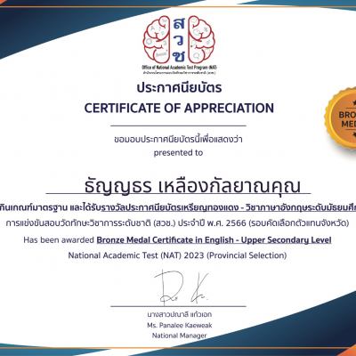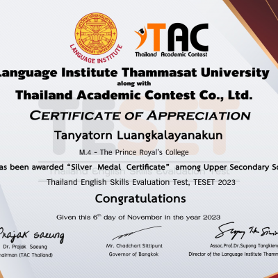- รางวัลเกียรติบัตรเหรียญเงิน Thailand English Skills Evaluation Test 2023 (TESET) (ระดับประเทศ) วันที่ 20 สิงหาคม 2023 ณ โรงเรียนวัฒโนทัยพายัพ จัดโดย Language Institution Thammasat University กับ Thailand Academic Contest Co.,Ltd.