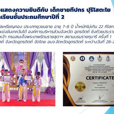 ขอแสดงความยินดีกับเด็กชายทีปกร ปุริโสตะโย นักเรียนระดับชั้นประถมศึกษาปีที่ 2 ได้รับรางวัลเหรียญทอง ประเภทยุวชนชาย อายุ 7-8 ปี น้ำหนักไม่เกิน 22 กิโลกรัม เคียวรูกิ (ต่อสู้) รายการการแข่งขันเทควันโด้ องค์การบริหารส่วนจังหวัด อุตรดิตถ์ ชิงถ้วยประราชทานสมเด็จพระกนิษฐาธิราชเจ้า กรมสมเด็จพระเทพรัตนราชสุดาฯ สยามบรมราชกุมารี ครั้งที่ 1 จัดโดย อบจ.จัดหวัดอุตรดิตถ์ ณ สนามกีฬาเทศบาลเมืองอุตรดิตถ์ จังหวัดอุตรดิตถ์ เมื่อวันที่ 28-29 พฤษภาคม 2665