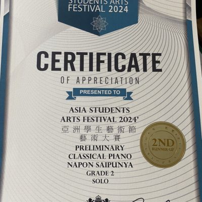 ขอชื่นชมและแสดงความยินดีบกับ เด็กชายนภนต์ สายปัญญา ชั้นประถมศึกษาปีที่ 2/1 ได้รับรางวัล 2ND Runner-up ในการแข่งขันเปียโน ระดับ เกรด 2 รายการ Asia Students Arts Festival 2024 รอบคัดเลือกปประเทศไทย จัดโดย โรงเรียนดนตรี Musicbakery Thailand (ตัวแทนจัดงาน ประเทศไทย) เมื่อวันที่ 5 พฤศจิกายน 2566