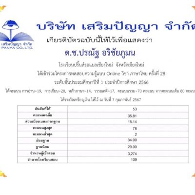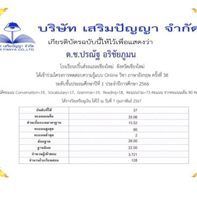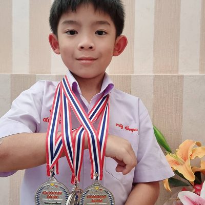 ได้รับรางวัล เหรียญเงิน วิชาภาษาอังกฤษ,ภาษาไทยและสังคมการทดสอบความรู้ออนไลน์ระดับชั้นป.1