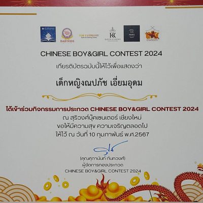 ขอชื่นชมและร่วมแสดงความยินดีกับเด็กหญิงณปภัช เอี่ยมอุดม ชั้นประถมศึกษาปีที่ 3 ได้รับรางวัลKIDS MODEL การประกวด CHINESE BOY&GIRL CONTEST 2024 ณ สุริวงศ์บุ๊คเซ็นเตอร์ เชียงใหม่ เมื่อวันที่ 10 กุมภาพัน 2567