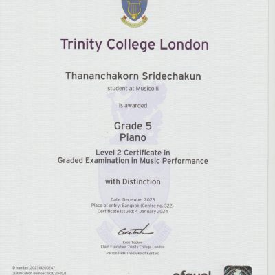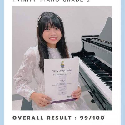 ที่ได้รับรางวัล Trinity Piano Grade เกียรตินิยมอันดับ 1 (Distinction) เกรด 5 ด้วยคะแนน 99/100