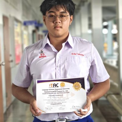 ขอชื่นชมและแสดงความยินดีกับ นายจิระวัฒน์ โตวัฒน์นิมิต นักเรียนชั้น ม.4/7 รับรางวัลเกียรติบัตรเหรียญเงิน (คะแนนอันดับที่ 46) ระดับประเทศ จากโครงการแข่งขันการพูดสุนทรพจน์ภาษาอังกฤษระดับประเทศ ประจำปี 2566 (Thailand English Speech Contest) เมื่อวันที่ 16 ตุลาคม 2566 จัดโดย Thailand Academic Contest