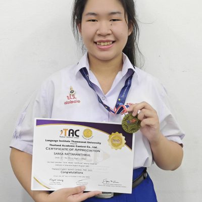 ขอชื่นชมและแสดงความยินดีกับ นางสาวสาริศา รัตนนิธิกุล นักเรียนชั้น ม.6/1 รับรางวัลเกียรติบัตรเหรียญทอง (คะแนนอันดับที่ 35) และเหรียญรางวัล ระดับประเทศ จากโครงการแข่งขันการพูดสุนทรพจน์ภาษาอังกฤษระดับประเทศ ประจำปี 2566 (Thailand English Speech Contest) เมื่อวันที่ 16 ตุลาคม 2566 จัดโดย Thailand Academic Contest