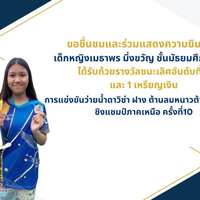 ขอชื่นชมและแสดงความยินดีกับ เด็กหญิงเมธาพร มิ่งขวัญ นักเรียนชั้นมัธยมศึกษาปีที่ 1 เข้าร่วมการแข่งขันว่ายน้ำดาวิซ่า ฝาง ต้านลมหนาวต้านยาเสพติด ชิงแชมป์ภาคเหนือ ครั้งที่10 วันที่ 10-11 กุมภาพันธ์ 2567 ณ สระว่ายน้ำศูนย์ฝึกกีฬาว่ายน้ำดาวิซาร่าฝาง อำเภอฝาง จังหวัดเชียงใหม่ รุ่นอายุ 13 ปีหญิง ได้รับรางวัล 1 เหรียญเงิน รายการ ผีเสื้อ 50 เมตร และถ้วยรางวัลชนะเลิศอันดับ 8 รุ่นอายุ 13ปีหญิง