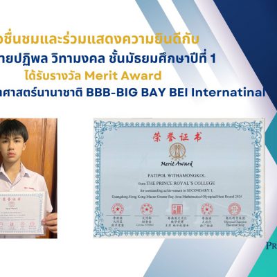 ขอชื่นชมและแสดงความยินดีกับ เด็กชาย ปฏิพล วิทามงคล นักเรียนชั้นมัธยมศึกษาปีที่ 1 ได้รับรางวัล Merit Award การแข่งขันคณิตศาสตร์นานาชาติ BBB-BIG BAY BEI Internatinal (Guangdong-Hong Kong-Macao Greater Bay Area Mathematical Olympiad Heat round 2023-2024) ดำเนินการโดย Olympiad Champion Education Center (OCEC) ประเทศฮ่องกง ซึ่งได้รับการรับรองจากกระทรวงศึกษาธิการฮ่องกงประกาศผลรางวัลเมื่อวันที่ 13 กุมภาพันธ์ 2567