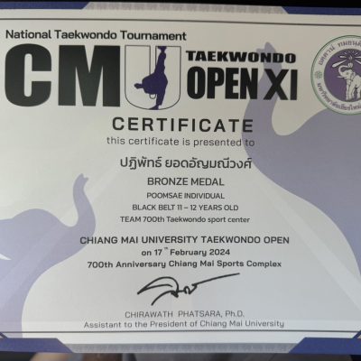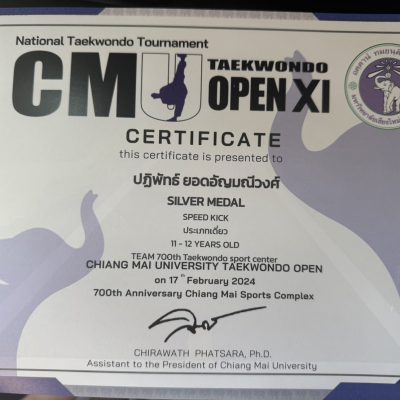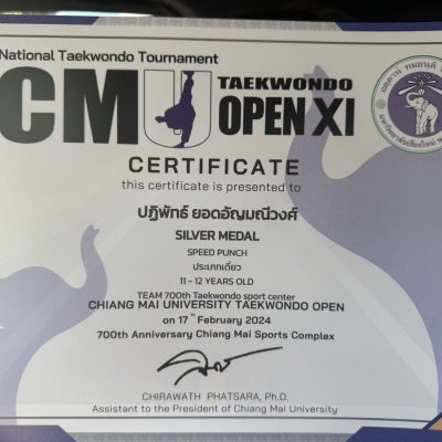 จากการแข่งขันเทควันโด ประเภท ต่อสู้รุ่นอายุ 11-12 ปี นำหนัก 39-42 กิโลกรัมในการแข่งขัน CMU Taekwondo Open ครั้งที่ 11