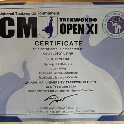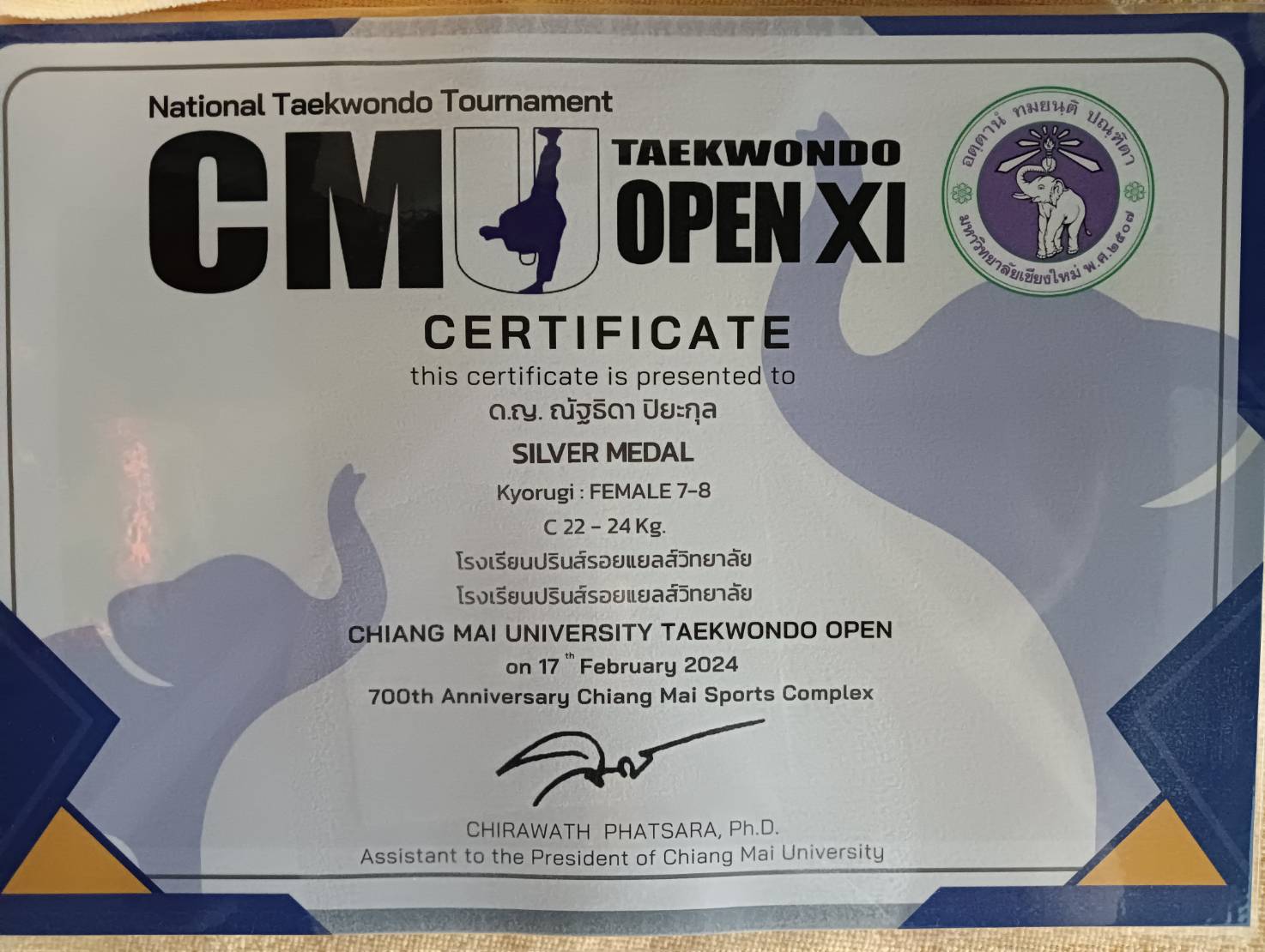 ได้รับรางวัลเหรียญเงิน 1 เหรียญ รายการ เทควันโด ประเภทต่อสู้(Kyorugi) หญิง 7-8ปีน้ำหนัก 22-23 Kg.