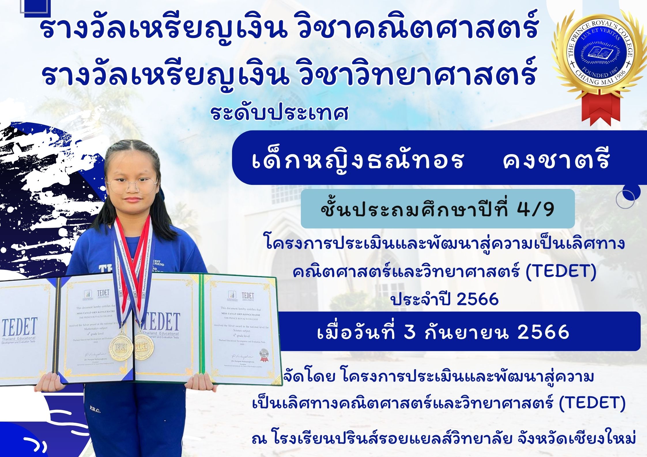 จากโครงการประเมินและพัฒนาสู่ความเป็นเลิศทางคณิตศาสตร์และวิทยาศาสตร์ (TEDET) ประจำปี 2566 เป็นรางวัลระดับประเทศ