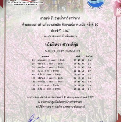 จากการแข่งขันว่ายน้ำ “ดาวิซาร่าฝาง ต้อนรับลมหนาวต้านภัยยาเสพติด ชิงแชมป์ภาคเหนือ ครั้งที่ 10 ประจำปี 2567″