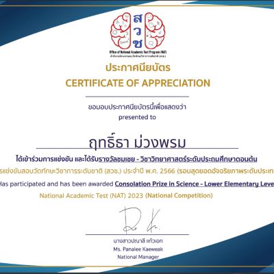 ที่ได้รับประกาศนียบัตรรางวัลชมเชย วิชาวิทยาศาสตร์ จากการแข่งขันสอบวัดทักษะวิชาการระดับชาติ (สวช) ประจำปี พ.ศ.2566 (รอบสุดยอดอัจฉริยภาพระดับประเทศ)