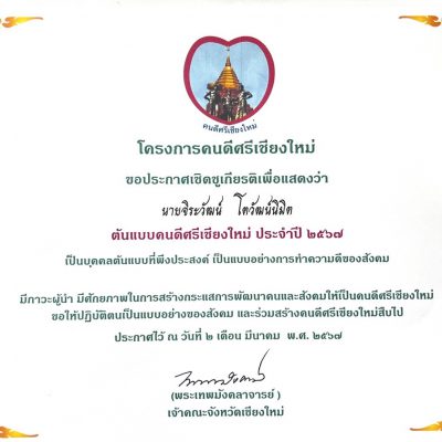 นายจิระวัฒน์ โตวัฒน์นิมิต  รับใบประกาศเชิดชูเกียรติ  “ต้นแบบคนดีศรีเชียงใหม่  ประจำปี 2567”