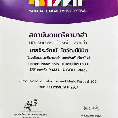 ขอชื่นชมและแสดงความยินดีกับ นายจิระวัฒน์ โตวัฒน์นิมิต ม.5/7 ที่ได้รับรางวัล YAMAHA GOLD PRIZE รอบคัดเลือกภาคเหนือ ประเภท Piano Solo รุ่นอายุไม่เกิน 18 ปี จากการประกวด Yamaha Thailand Music Festival 2024 เมื่อวันที่ 27 มกราคม 2567 (รูปแบบออนไลน์) จัดโดย บริษัท สยามดนตรียามาฮ่า จำกัด