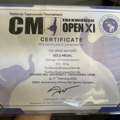 ขอชื่นชมและแสดงความยินดีกับเด็กชายปกรณ์ สุขกายยิ่ง อนุบาล 3/3 รางวัลเหรียญทอง ประเภทต่อสู้ (Kyorugi) ชาย 5 ปี น้ำหนัก 15 – 18 รายการแข่งขัน CM TAEKWONDO OPEN XI จัดโดย ชมรมเทควันโด มหาวิทยาลัยเชียงใหม่ วันที่ 17 กุมภาพันธ์ 2567 ณ โรงยิมพลศึกษา 2 สนามกีฬาสมโภช 700 ปี
