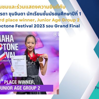 ขอชื่นชมและแสดงความยินดีกับ เด็กหญิงฐิติวรดา ขุนจินดา นักเรียนชั้นมัธยมศึกษาปีที่ 1 ได้รับ รางวัล 3rd place winner Junior Age Group 2 จากผู้เข้าแข่งขัน 15 ประเทศทั่วโลก ในการแข่งขัน Electone ระดับโลก Yamaha Electone Festival 2023 รอบ Grand Final ระหว่างวันที่ 27 – 28 มกราคม ที่ Yomiuri Hall กรุงโตเกียว ประเทศญี่ปุ่น
