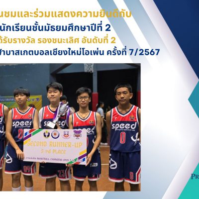 ขอชื่นชมและแสดงความยินดีกับ นักเรียนชั้นมัธยมศึกษาปีที่ 2 ได้รับรางวัลรองชนะเลิศ อันดับที่ 2 รุ่นอายุไม่เกิน 15 ปี ชาย การแข่งขันกีฬาบาสเกตบอลเชียงใหม่โอเพ่น ครั้งที่ 7/2567 (BASKETBALL CHIANGMAI OPEN 7th 2024) ชิงถ้วยรางวัล นายกสมาคมกีฬาบาสเกตบอลแห่งประเทศไทย จัดโดย สมาคมกีฬาบาสเกตบอลแห่งประเทศไทย มหาวิทยาการกีฬาแห่งชาติ วิทยาเขตเชียงใหม่ และสมาคมกีฬาแห่งจังหวัดเชียงใหม่และฝ่ายกีฬาบาสเกตบอล จ.เชียงใหม่ ระหว่าง วันที่ 1 – 17 มี.ค. 2567 ณ โรงยิมเนเซียม 3 สนามกีฬาเทศบาลนครเชียงใหม่