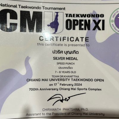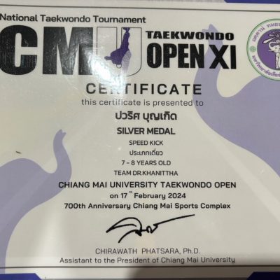 ขอชื่นชมและแสดงความยินดีกับเด็กชายปวริศ บุญเกิด อนุบาล 3/10 รางวัลเหรีญเงิน 2 เหรียญ SILVER MEDAL SPEED PUNCH, SILVER MEDAL SPEED KICK รายการแข่ง CM TAEKWONDO OPEN XI จัดโดย ชมรมเทควันโด มหาวิทยาลัยเชียงใหม่ วันที่ 17 กุมภาพันธ์ 2567 ณ โรงยิมพลศึกษา 2 สนามกีฬาสมโภช 700 ปี