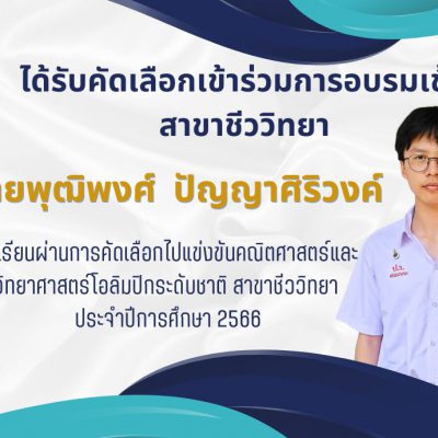 ขอชื่นชมและแสดงความยินดีกับ นายพุฒิพงศ์ ปัญญาศิริวงค์ ม.5/3 ที่เข้าค่ายโอลิมปิกวิชาการ ค่าย 2 ปีการศึกษา 2566 สาขาชีววิทยา เมื่อวันที่ 24 กุมภาพันธ์ – 10 มีนาคม 2567 และได้รับคัดเลือกเพื่อแข่งขันคณิตศาสตร์และวิทยาศาสตร์ โอลิมปิกระดับชาติ ประจำปีการศึกษา 2566 สาขาชีววิทยา (เป็น 1 ใน 6 คนของภาคเหนือ) และได้เข้าร่วมการอบรมเข้ม ระหว่างวันที่ 29 มีนาคม – 2 เมษายน 2567 ณ ภาควิชาชีววิทยา คณะวิทยาศาสตร์ มหาวิทยาลัยเชียงใหม่ จัดโดยคณะวิทยาศาสตร์ มหาวิทยาลัยเชียงใหม่