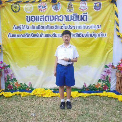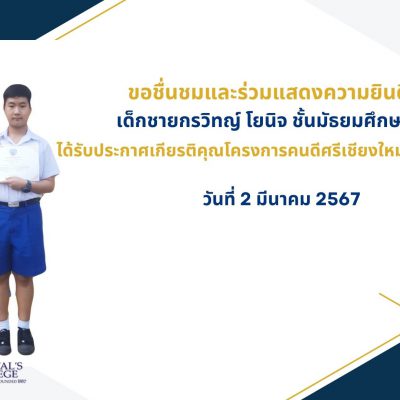 ขอชื่นชมและแสดงความยินดีกับ เด็กชายกรวิทญ์ โยนิจ นักเรียนชั้นมัธยมศึกษาปีที่ 1 ได้รับใบประกาศเกียรติคุณโครงการคนดีศรีเชียงใหม่ประจำปี 2567 เมื่อวันที่2 มีนาคม 2567 ณ มหาวิทยาลัยฟาร์อีสเทอร์นเชียงใหม่