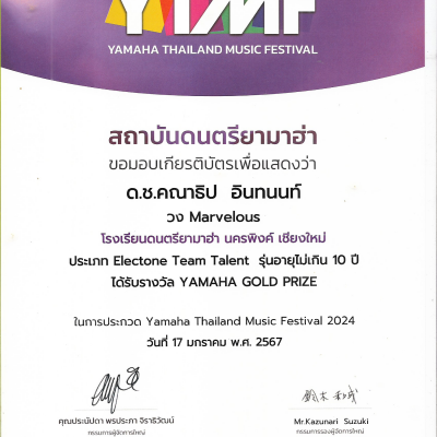 เด็กชายคณาธิป อินทนนท์ ชั้นประถมศึกษาปีที่ 2/5 ได้รับรางวัล YAMAHA GOLD PRIZE รายการ Yamaha Thailand Music Festival 2024 ประเภท Electone Team Talent รุ่นอายุไม่เกิน 10 ปี