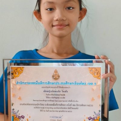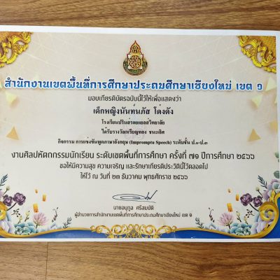 ขอแสดงความชื่นชมยินดีกับเด็กหญิงนันท์นภัส โด่งดัง ชั้นประถมศึกษาปีที่ 3/3 ได้รับรางวัลอันดับ 1 เหรียญทอง ชนะเลิศ รายการ: การแข่งขันพูดภาษาอังกฤษ ( Impromptu Speed)เมื่อวันที่ 23 ธันวาคม 2566 โดยหน่วยงาน สำนักงานเขต พื้นที่การศึกษา ประถมศึกษาเชียงใหม่ เขต 1ระดับ เขตพื้นที่การศึกษา ครั้งที่ 71