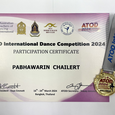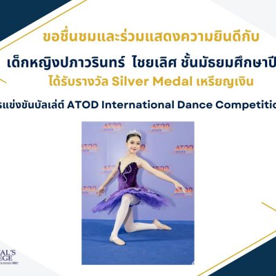 ขอชื่นชมและแสดงความยินดีกับ ด.ญ.ปภาวรินทร์ ไชยเลิศ ชั้น มัธยมศึกษาปีที่ 1 ห้อง 1/5 ได้รับรางวัล Silver Medal เหรียญเงิน ( 80-89 marks) การแข่งขันบัลเล่ต์ ประเภท Classical Ballet Syllabus Silver Medal จากการแข่งขันระดับนานาชาติ ATOD International Dance Competition 2024 ณ. Aksra Theater Bangkok Thailand เมื่อวันที่ 19 มีนาคม พ.ศ.2567